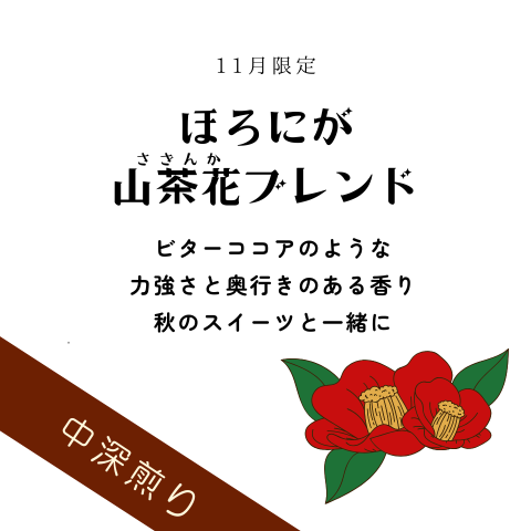 さざんかの花言葉「ひたむきさ」をイメージした秋のスイーツ達にぴったりなブレンド。ビターココアのような力強さと奥行きのある香り、キレのある苦みと丸みのあるコクの調和がとれた完煎ほろにがブレンド。