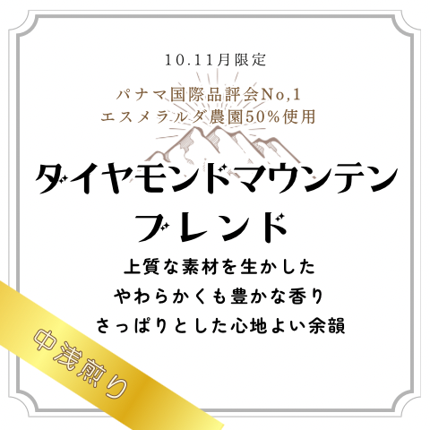 パナマ国際品評会チャンピオン歴がある有名なパナマ・エスメラルダ農園産ダイヤモンドマウンテンを贅沢に50%使い、上質な素材を生かしたバランスのよいマイルドブレンド。やわらかくも豊かな香り、さっぱりとした心地よい余韻。